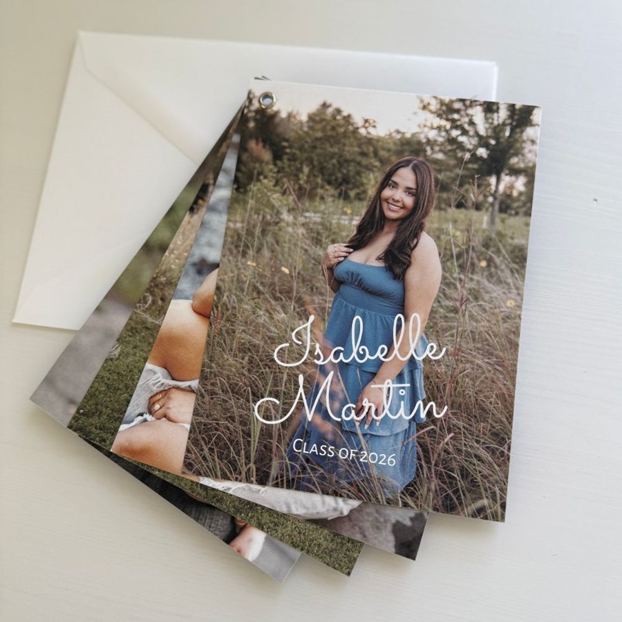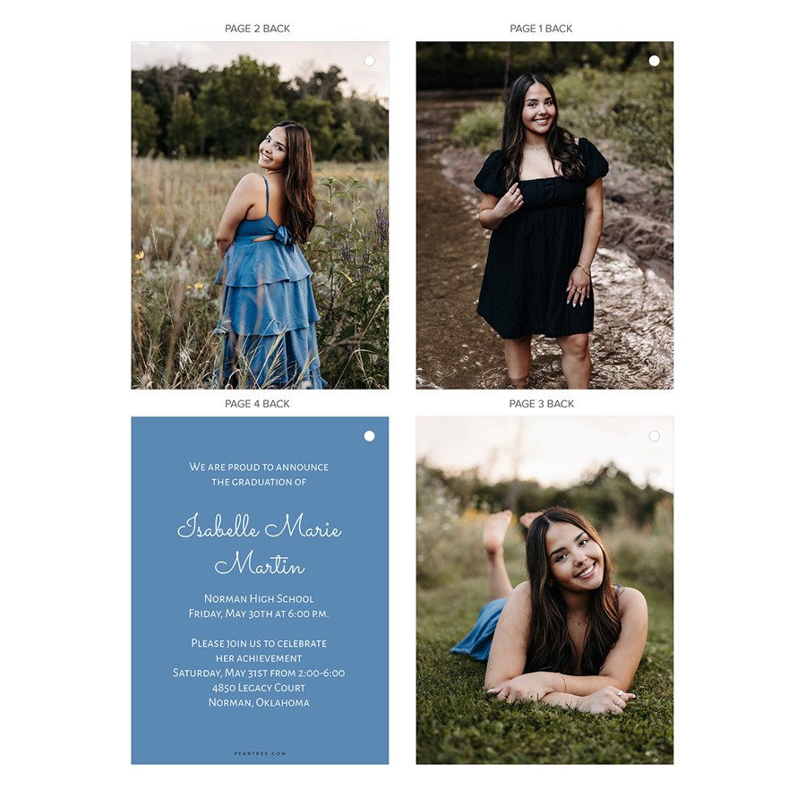 Designed to feel like a keepsake, the Timeless Graduation Invitations showcase your graduate’s story in a unique booklet format. The swatch-book style invitation opens to four pages, starting with a front photo featuring the graduate’s name and graduation year printed at a stylish angle. Additional pages highlight full-photo layouts, with the final page dedicated to party or commencement details. With customizable fonts, colors, and backgrounds, this grommet-bound graduation invitation feels classic, polished, and personal.