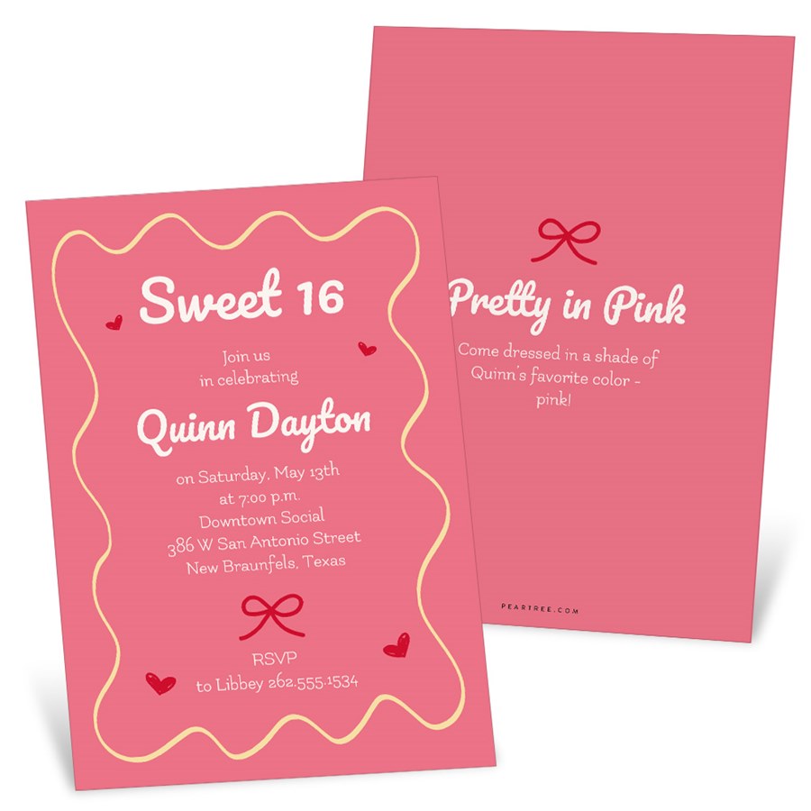 Perfect for milestone moments, the Sweet Celebration Birthday Party Invitation adds charm and whimsy to your sweet celebration. This flat, two-sided invite features playful squiggle borders, hearts, and bow artwork with customizable colors. The front showcases party details, while the back includes space for additional information and a coordinating bow design. With its soft, fun style, this birthday party invitation sets the tone for a sweet and stylish celebration.