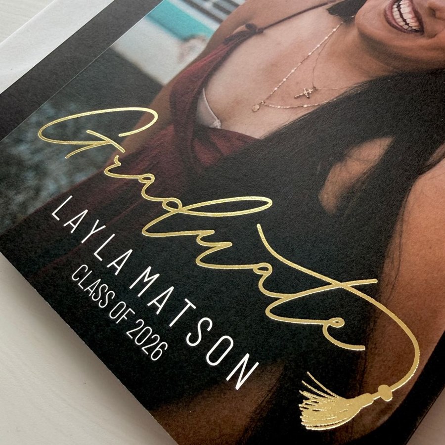 Celebrate in shining style with the Shining Tassel Graduation Invitations featuring real foil stamping on the “Graduate” artwork and tassel detail in the foil color of your choice. This flat, two-sided design includes rounded die-cut corners for an elevated look. Add custom text, fonts, and colors to personalize every detail. The back can be customized with our template options to fit your event information or announcement wording. It can also double as your Graduation Announcement.