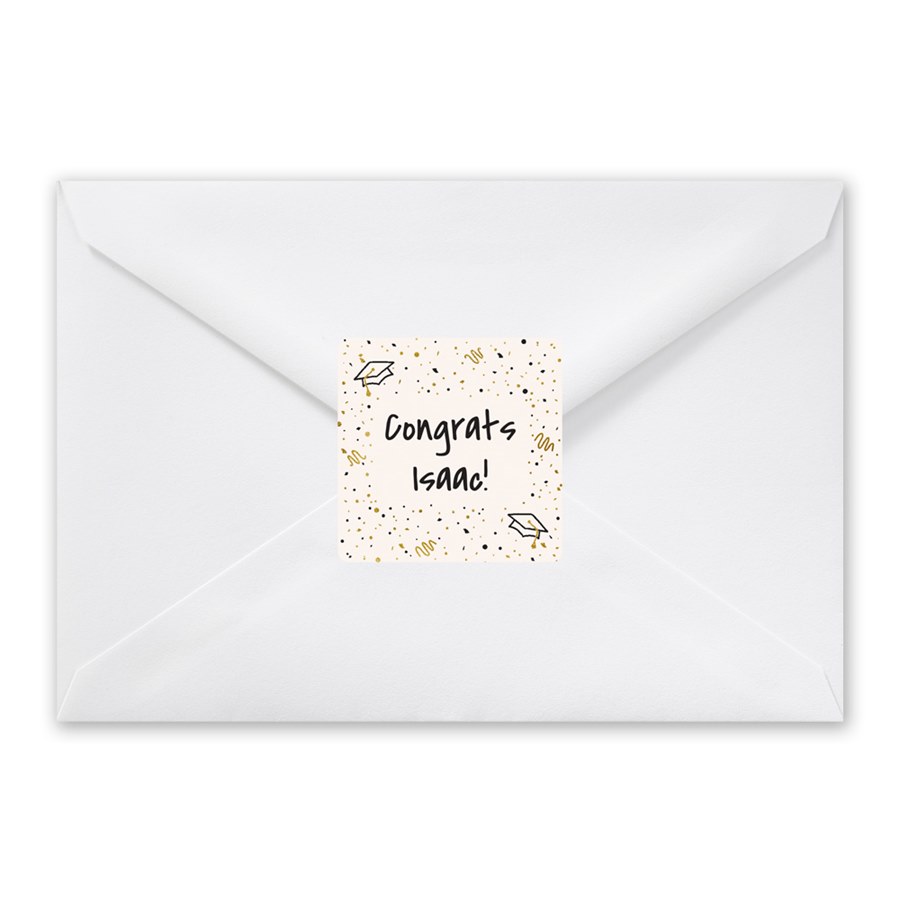 Dress up your mail with the Grad Celebration Graduation Envelope Seals featuring grad hats and digital gold and colored confetti. These square seals can be customized with background color and text. Perfect for graduation announcements or graduation invitations. They instantly feel festive.