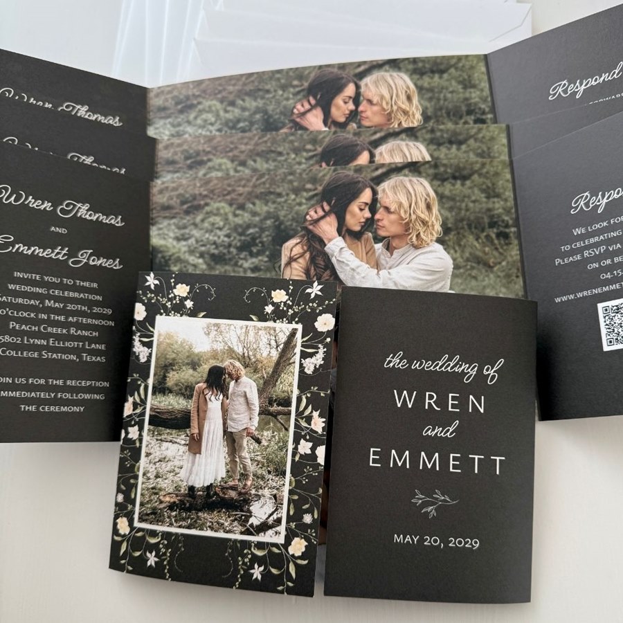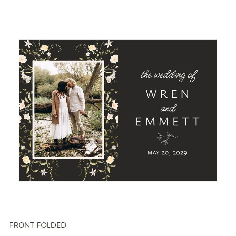 Romantic and fresh, the Wild Border Wedding Invitation brings natural beauty to your stationery. The gatefold front displays your favorite photo, surrounded by a delicate white wildflower border and a background color of your choice. Inside, you’ll find space for your wedding details and additional photos, giving your guests both charm and clarity. The back can be personalized with another image and coordinating colors to complete the look. A perfect choice for floral wedding invitations or couples who love a garden-inspired style.