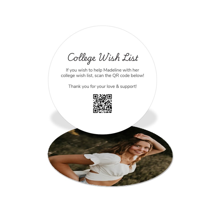 Make gift-giving simple with the Wish List Graduation Insert Card, a stylish round insert guests will appreciate. Add it to your graduation announcement envelope. The front features custom text and background color along with a QR code linking to a college wish list or payment app. A full photo on the back adds a personal finishing touch. This two-sided circle card blends photo flair with helpful convenience.