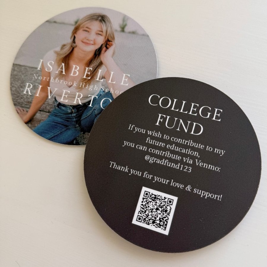 Keep things sleek and stylish with the The Minimalist Graduation Insert Card, a clean round design to add to your graduation announcement suite. The front features a full photo with custom text layered over it for a modern look. On the back, add more details with your choice of background color and wording, plus a QR code for college fund contributions. This two-sided circle insert is simple, polished, and photo-forward.