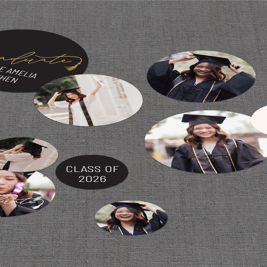 Add shine to your graduation celebration with Golden Tassel Jumbo Graduation Confetti, festive photo circles with stylish details. Several pieces display photos while others feature “Graduate” artwork accented with a tassel design. Digital gold ink and customizable colors make this table decor feel bright, polished, and grad party-ready.