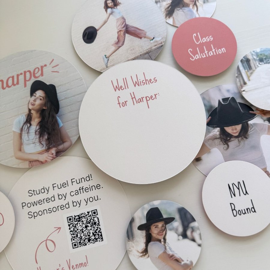 Make your graduation party setup pop with The Breakdown Jumbo Graduation Confetti, bold photo circles with energetic style. Starburst accents, custom text, and double-sided images create a lively look. Add a QR code so guests can send a fun caffeine fund or digital gift right from the grad party table decor.