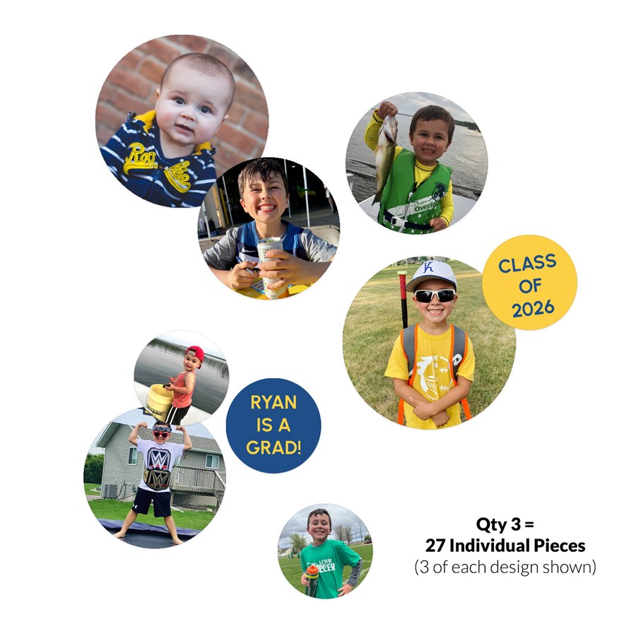 Celebrate milestones with Through the Years Jumbo Graduation Confetti, vibrant photo circles full of memories. Double-sided images showcase childhood photo favorites while custom text adds personality. A QR code option lets guests send gifts instantly, making this graduation party table decor both fun and functional.