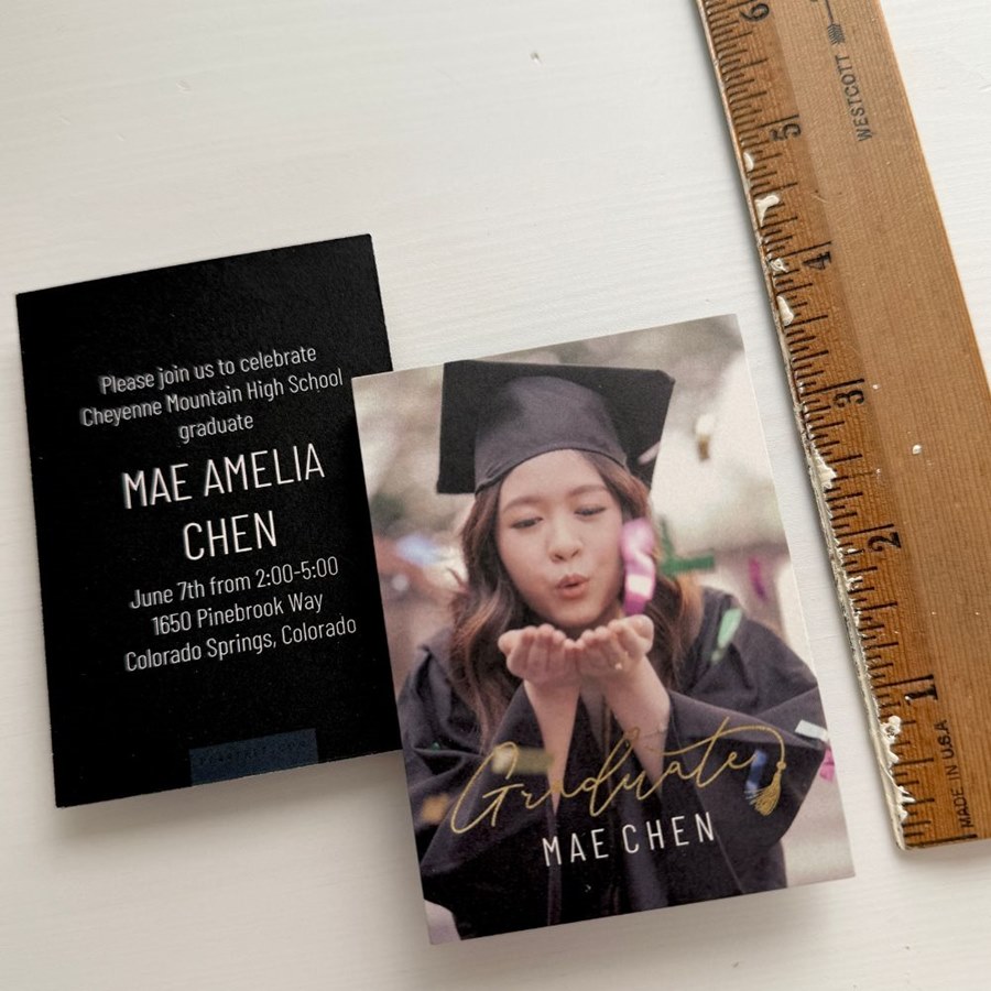 Shiny and celebratory, the Golden Tassel Mini Graduation Party Invitation is a flat, two-sided mini graduation party invitation that stands out. The front features your senior’s photo with “Graduate” in digital gold ink and a tassel detail. This mini, small invitation is perfect to hand out at school and can double as a graduation announcement. Add party information on the back for a complete photo invitation. A gold accent and bold graduate design make this one shine.