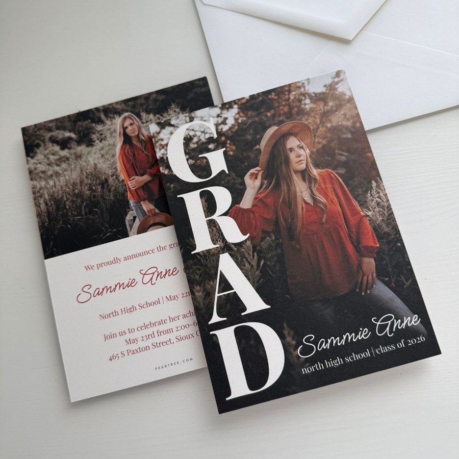 Show off their biggest accomplishment with this Rising Grad Graduation Invitation, a modern design that puts their photo front and center. This flat, two-sided graduation invitation features a full photo with the word "GRAD" printed vertically along the side. Customize the placement of text and adjust all the colors to match school colors or party decor. The back offers flexible template options for adding details about the celebration. A bold and stylish option for photo graduation invitations that can also double as your graduation announcement.
