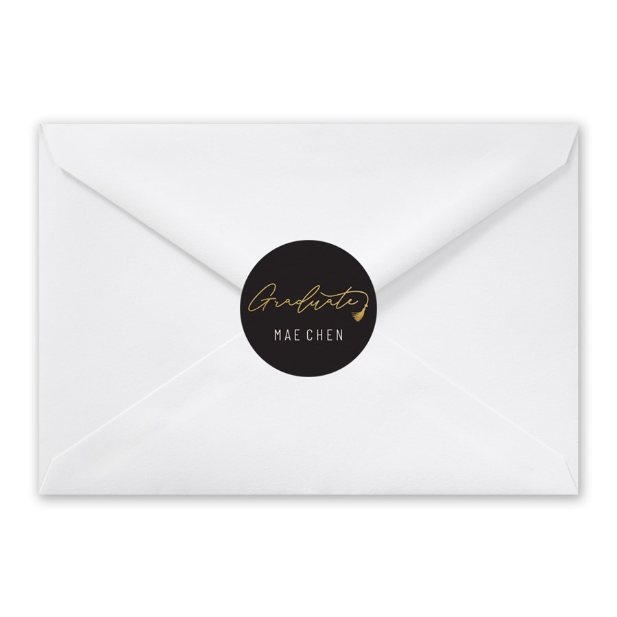 Add a polished finishing touch to your envelopes with these Golden Tassel Graduation Envelope Seals. These round sticker seals feature the word “Graduate” in elegant script with a tassel detail printed in digital gold ink. Customize the background color and add the grad’s name for a personal look. The classic round design pairs beautifully with graduation invitations or announcements. A stylish seal sticker with a gold tassel detail that celebrates your graduate in timeless fashion.