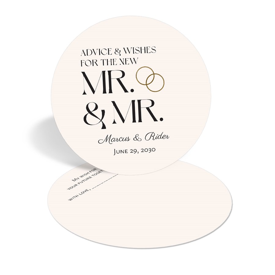 Celebrate love and lasting memories with this Vowed Mr. & Mr. Wedding Advice Card. The front features “Advice & Wishes for the New Mr. & Mr.” with gold rings printed in digital gold ink. Add the couple’s names and customize the colors to match your wedding theme. The back offers space for guests to write heartfelt advice and messages. A meaningful keepsake advice card designed for newlyweds to treasure.