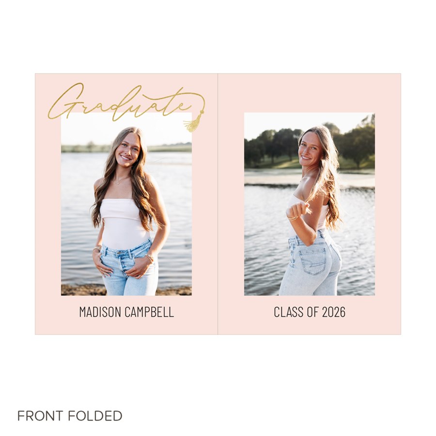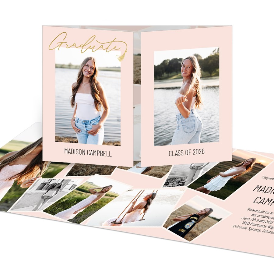 Celebrate your graduate with the Golden Grad Graduation Party Invitation, a bold graduation party invitation featuring two photos and the word “Graduate” displayed above the image in real foil with a fun tassel detail. Choose the foil color that best matches your graduate’s style or school colors for a shining, premium finish. The gatefold design opens to reveal a nine-photo collage along with space for your graduation party details. Customize background colors and text to coordinate perfectly with your celebration. It’s a standout graduation invitation with photos, foil accents, tassel details, and a memorable collage layout that can also double as a graduation announcement.