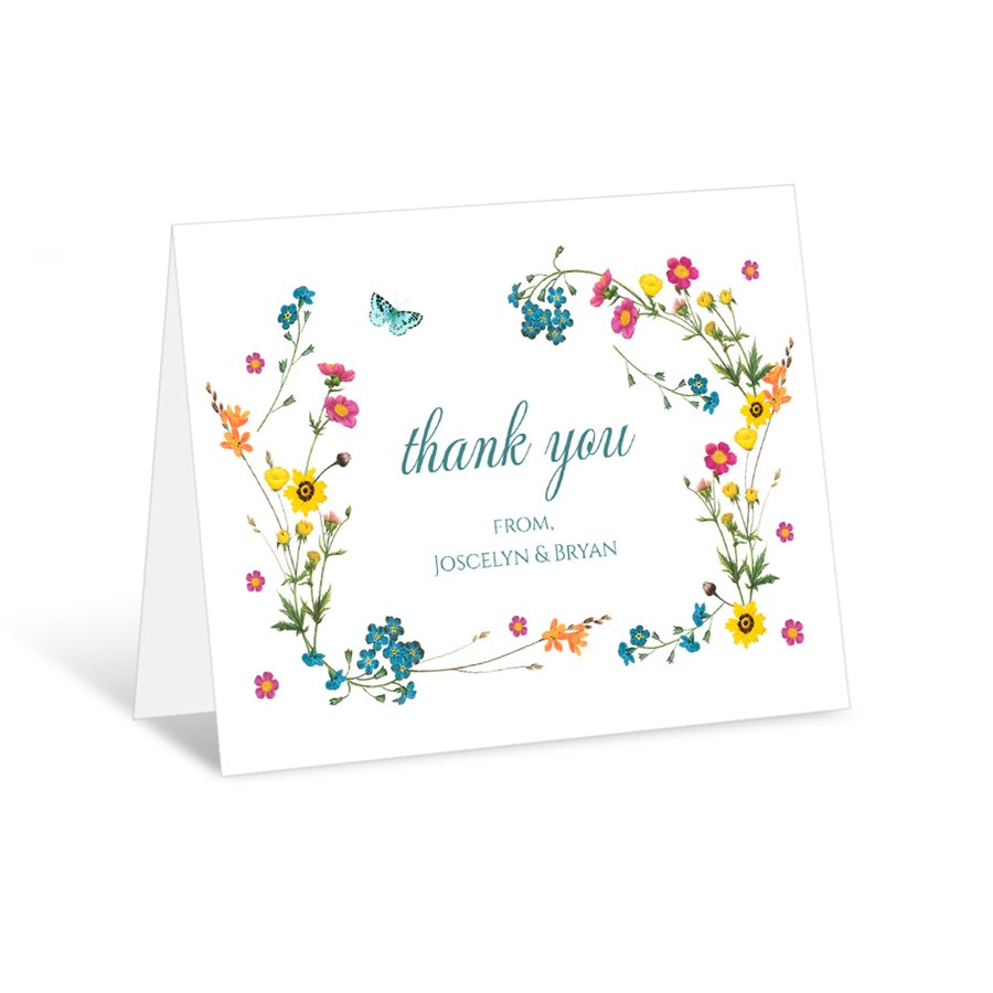 Brighten someone’s day with the Whimsical Floral Thank You Card, filled with cheerful blooms and butterflies. This folded thank you card features a white background with colorful flowers in yellow, pink, orange, blue, and green along with butterfly accents. Add your custom message to the center for a personal touch. Inside, choose between a printed note or handwritten message.