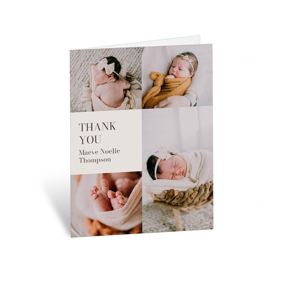 Share multiple memories with the Baby Feature Thank You Card, a photo collage design full of personality. This folded thank you card features four photos paired with a customizable color block for your message. It’s perfect for showcasing special moments while expressing your thanks. Inside, add a printed note or leave it blank.