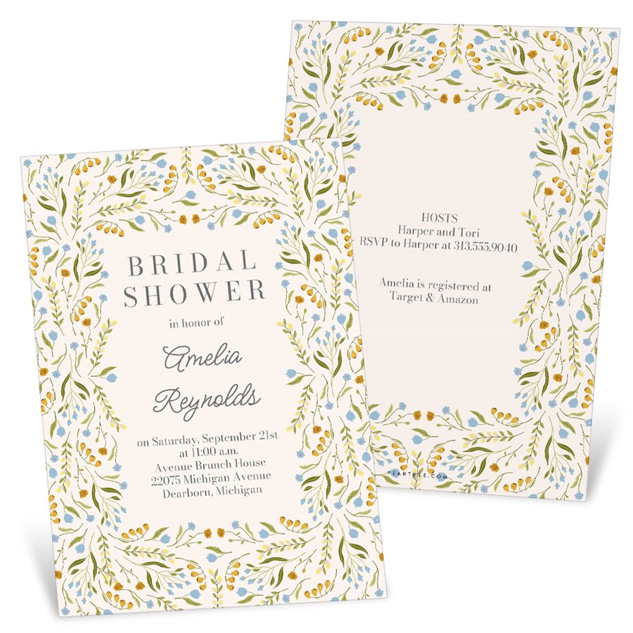 Bring a fresh floral feel to your celebration with these Blossom and Vine Bridal Shower Invitations, a flat, two-sided bridal shower invitation featuring a border of blue and yellow flowers with greenery accents and the background color of your choice. Add your bridal shower wording to the front, including all the important event details, and use the back for RSVP and registry information, while the floral border frames your text beautifully and gives the entire design a bright, garden-inspired feel.