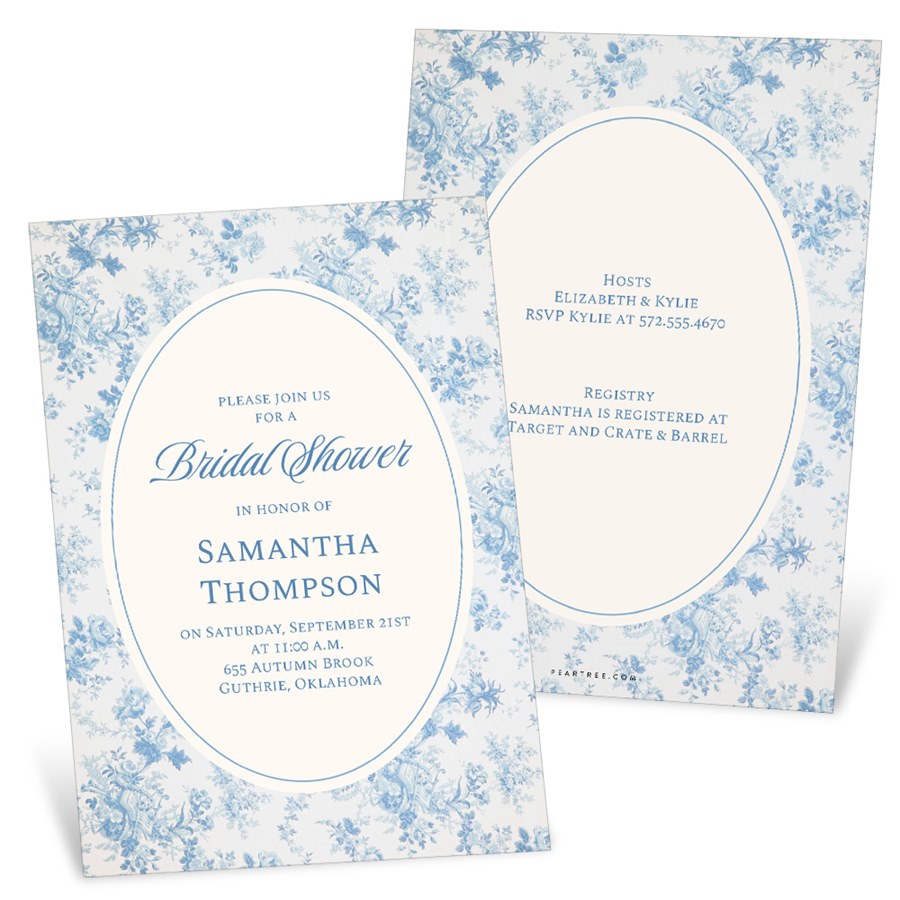 Embrace timeless elegance with Vintage Toile Bridal Shower Invitations, a flat, two-sided bridal shower invitation featuring a blue and white toile floral border with an oval frame. Add your bridal shower wording to the front and use the back for RSVP details, registry information, and more, creating a balanced layout that’s both functional and beautifully styled.