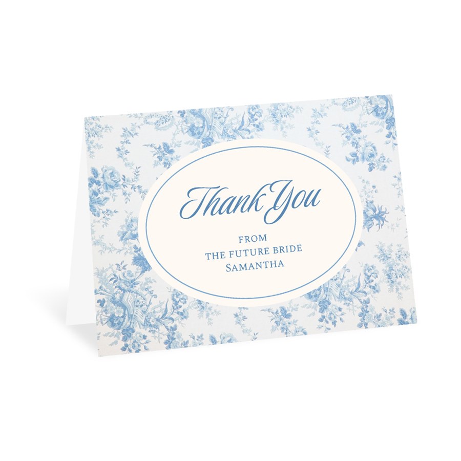 Send a polished note with Vintage Toile Thank You Card, a folded thank you card featuring a blue and white toile floral pattern and oval frame for your message. Inside, you can add a printed message or leave it blank for a handwritten note. The folded format and classic design make it a beautiful way to share your appreciation.