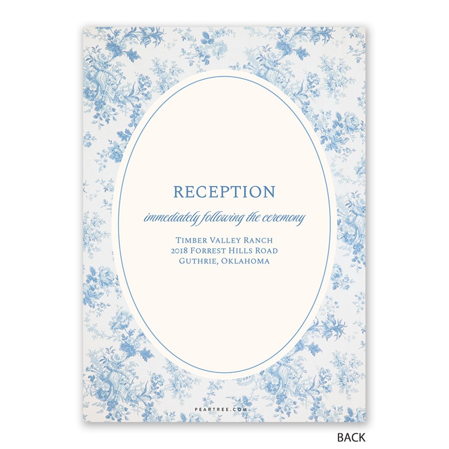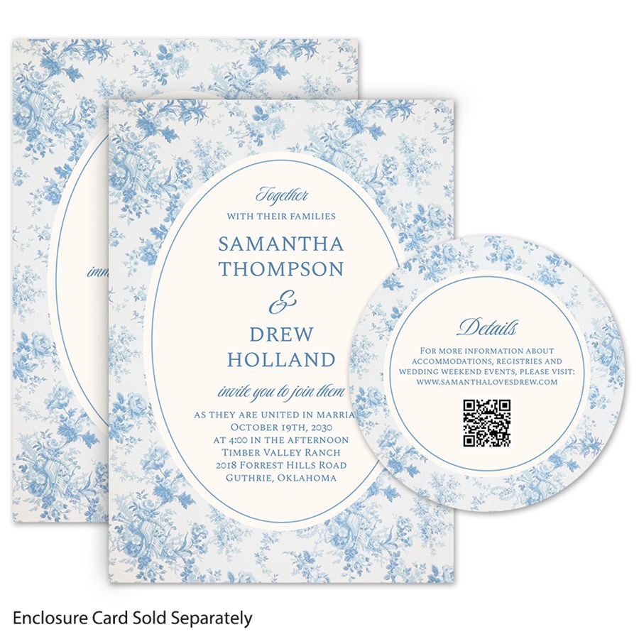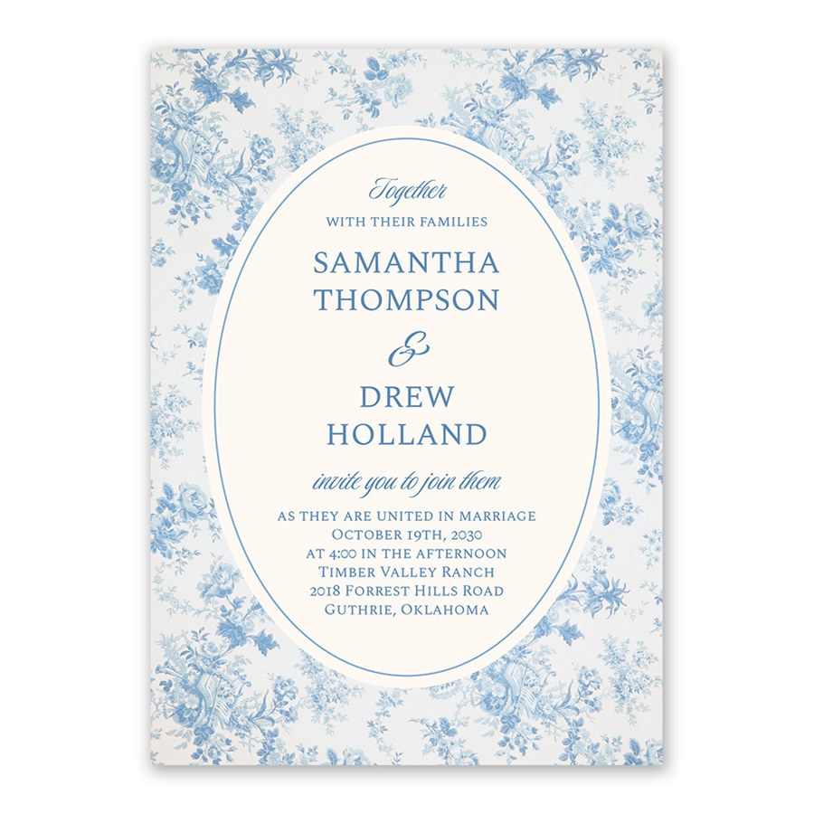 A timeless look sets the tone for your big day with the Vintage Toile Wedding Invitations, featuring a delicate blue and white vintage floral border on both sides. The oval frame highlights your wording with classic charm while keeping everything beautifully organized. Personalize your wedding invitations by adjusting fonts and text colors to match your style. The flat, two-sided format gives you plenty of room for details without overwhelming the design. Perfect for couples drawn to toile, vintage, blue and white invitation styles.