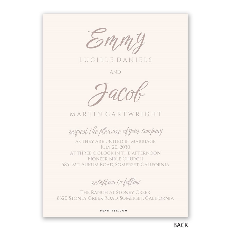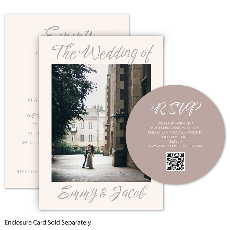 Make a bold impression with these Standout Script Wedding Invitations, featuring a full photo framed by a custom-colored border. Add text to the top and bottom for a balanced, eye-catching layout. The back offers space for all your wedding details. Customize fonts and colors to suit your theme. Perfect for photo invitations with a frame-style design.