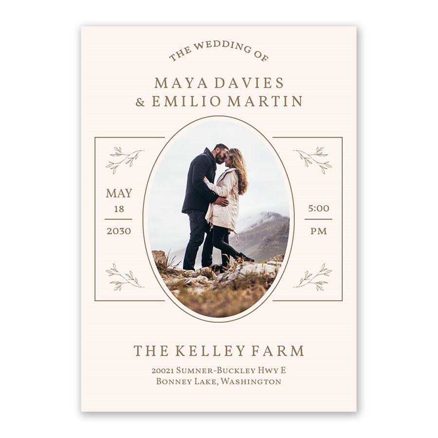 A romantic and classic style comes to life with these Timeless Union Wedding Invitations, featuring an oval photo framed by delicate borders and greenery accents. “The Wedding of” appears in curved text for an elegant touch. Customize all colors, editable fonts, and wording to fit your vision. The back includes additional space for wedding details. Perfect for couples that love vintage-inspired details with customized design.