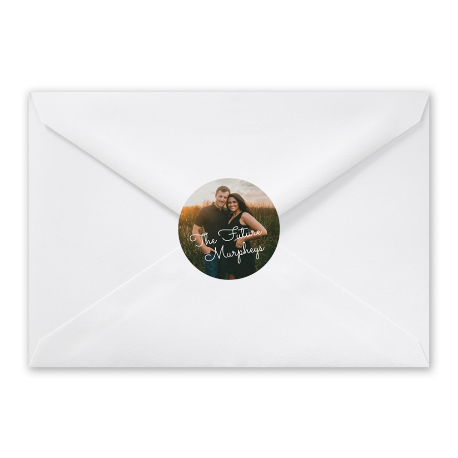 A modern slanted style defines Effortless Script Envelope Seals, featuring a full photo with angled text for a stylish look. Customize fonts and colors to match your stationery. The round format keeps everything cohesive and stylish.