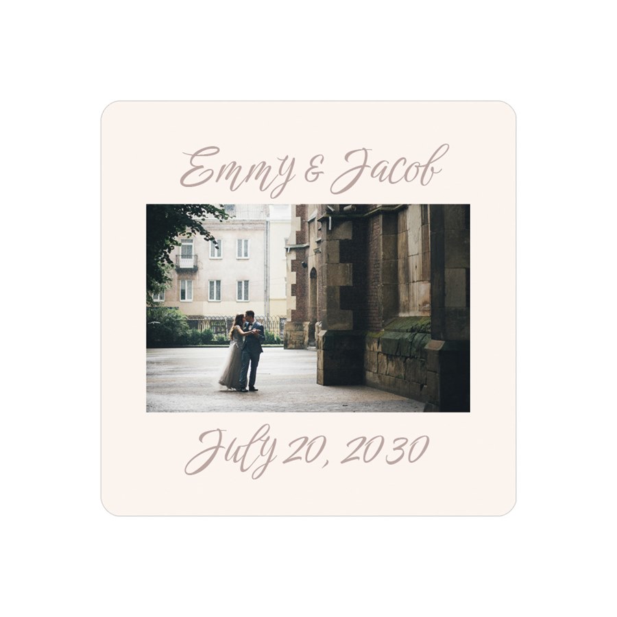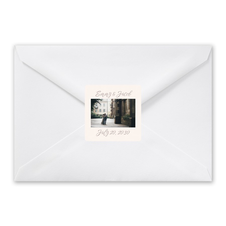 A framed design adds dimension to the Lovely Font Envelope Seals, featuring a photo with a customizable frame background and text. Choose your fonts and colors for a personalized finish. The square shape gives it a modern edge.