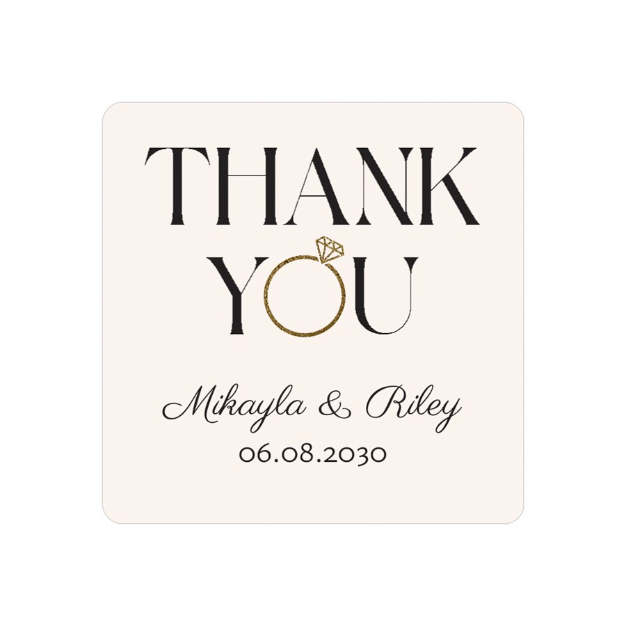 Elegant with a touch of shine, the Vowed wedding sticker features “Thank You” at the top with a gold ring detail forming the “O,” printed in digital gold ink. Add your custom text below and choose your background and text colors for a personalized finish. This square sticker favor blends modern design with a hint of sparkle. It’s a stylish way to incorporate a ring and diamond-inspired detail into your favors.