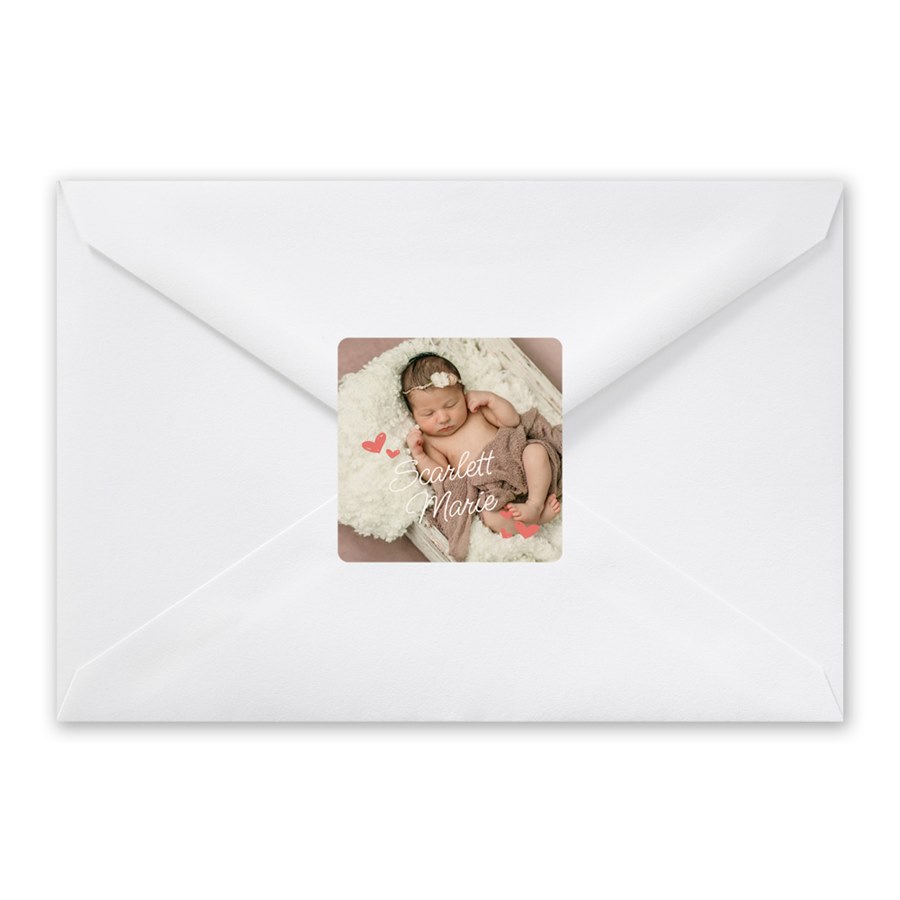 Add a heartfelt finishing touch to your envelopes with the Darling Debut Envelope Seals, featuring your baby’s photo and name surrounded by sweet heart accents. These square seals are a simple yet meaningful way to coordinate your stationery. Designed to complement your announcements, they bring a cohesive and polished look. Customize the colors and fonts to match your theme perfectly.