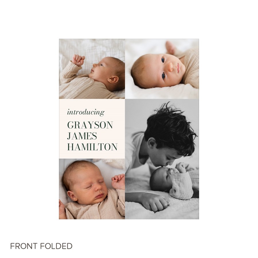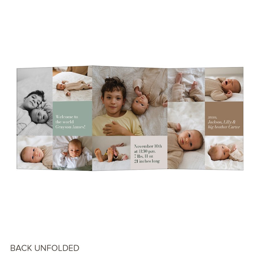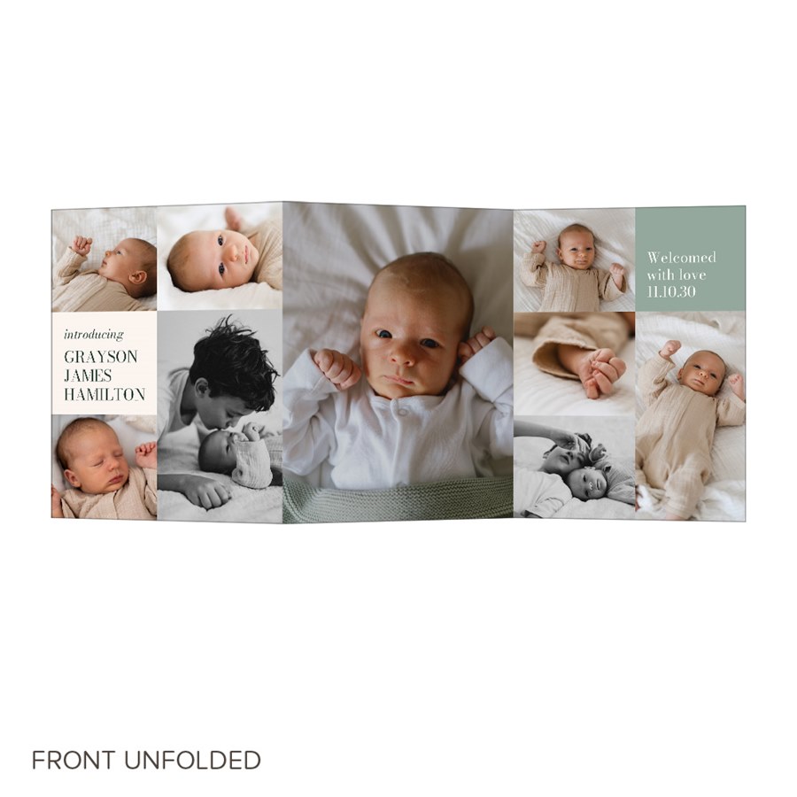 Tell your baby’s story through photos with the Photo Filled Birth Announcements, a trifold design that offers plenty of space for a full collage of memories and moments. With multiple photo squares across both sides, you can showcase every adorable moment. There’s also room for your baby’s name and custom text to complete the look. This layout is perfect for parents who want to share it all. Customize colors and fonts to make this photo collage feel uniquely yours.