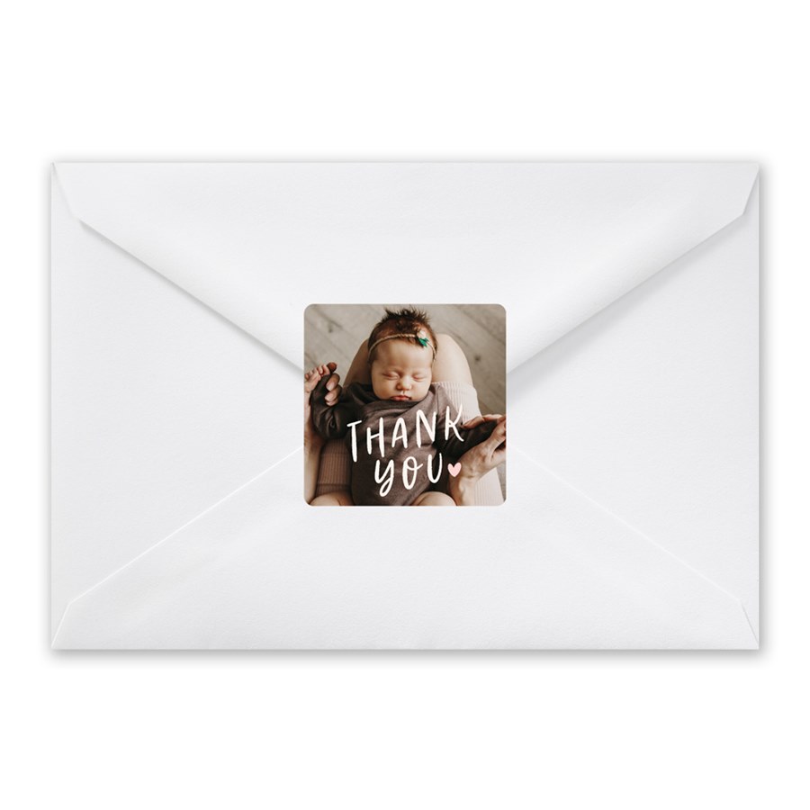 Add a polished finishing touch to your mail with the Sweetest Thank You Envelope Seals, featuring a full photo and modern “Thank You” text accented with a heart. These square seals are perfect for tying your stationery together. The design feels clean, warm, and inviting. Customize all colors to match your look.